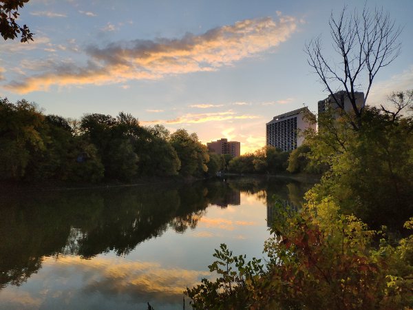 I did return to the park later in the day to get a photo of the sunset, or, at least, a picture of the same place while the sunset was happening in the opposite direction (the west). So here’s both: