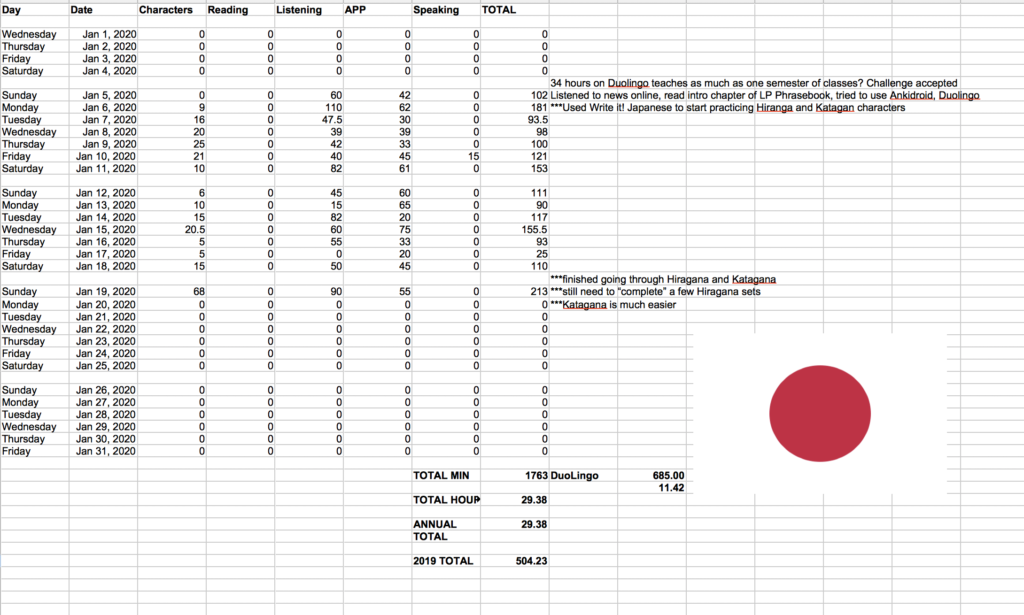 My spreadsheet tells me I’ve spent about 29.5 contact hours with the language. I use the term “contact hours” because it includes both the intensive study of using a couple of APPs and the passive listening I do in my spare time. Here’s a look at my time so far:
