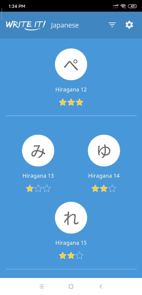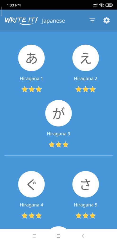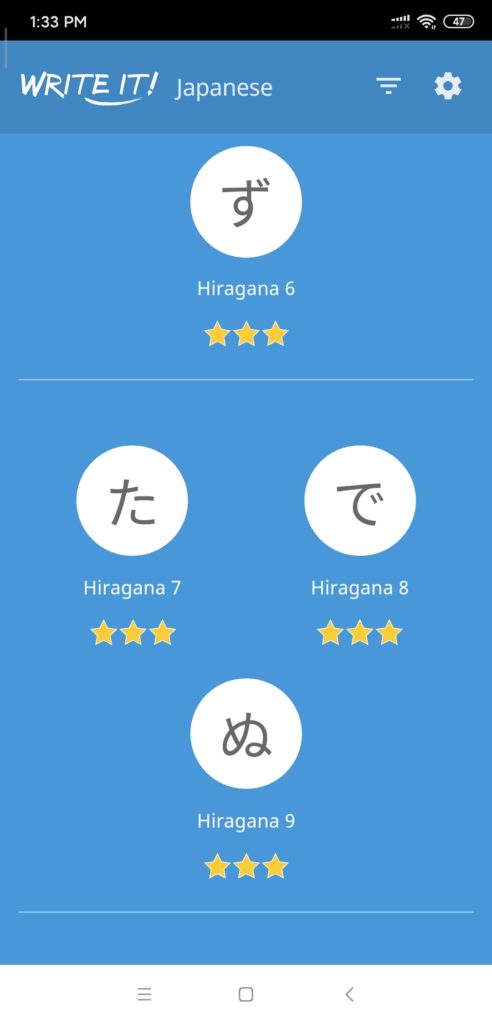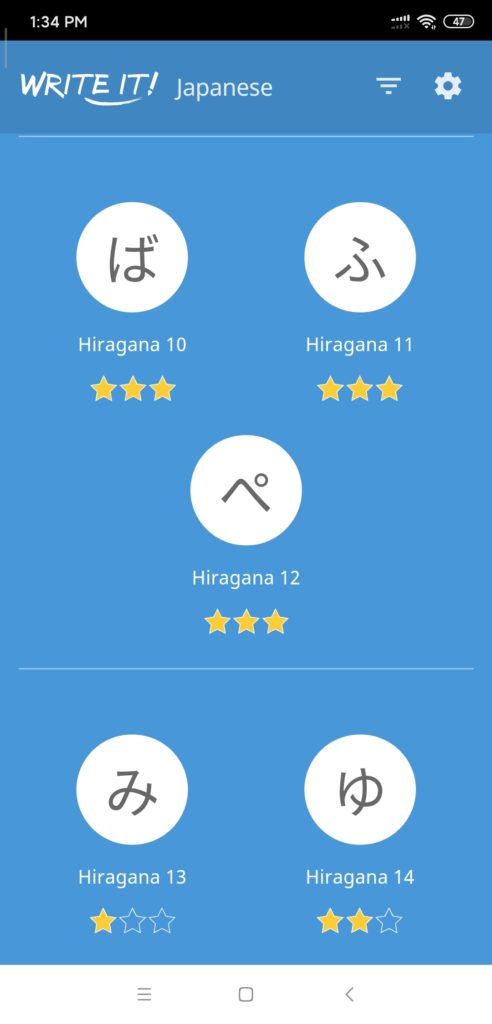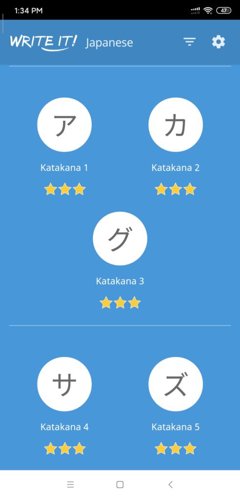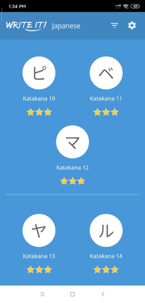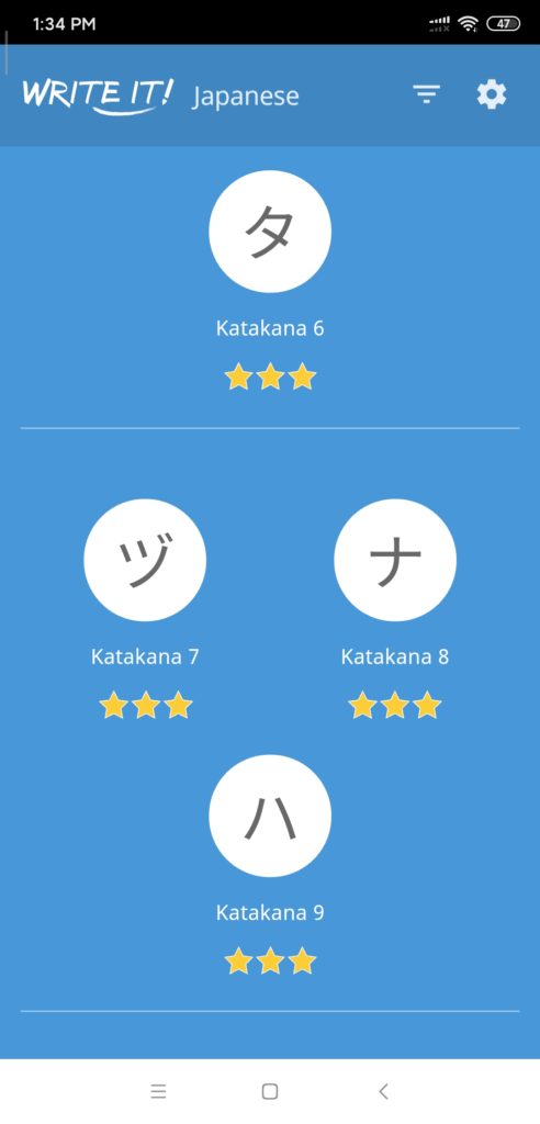 In addition to using DuoLingo for my studies, I also downloaded a writing APP called Write it! Japanese so I could practice the Hiragana and Katagana characters, also known as “Kana”. These are the phonetic representations of Japanese words for both the native and foreign elements in the language.