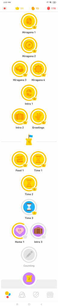 The “JPLT level” is similar to the HSK levels in Chinese but they count the other way around. So, N5 is easy and N1 would be difficult. But, as you can see, the number of targeted words and characters to be learned has been increased from the previous edition of the APP so I’m not sure how long it will take to complete. Here is my “tree” as it stands in Duolingo: