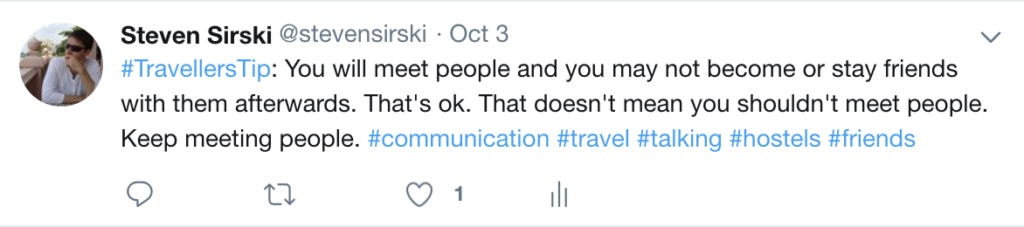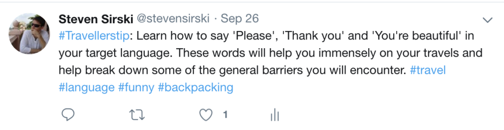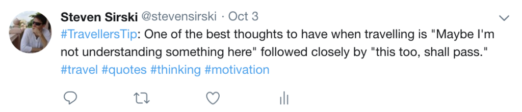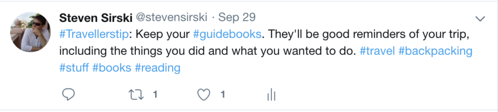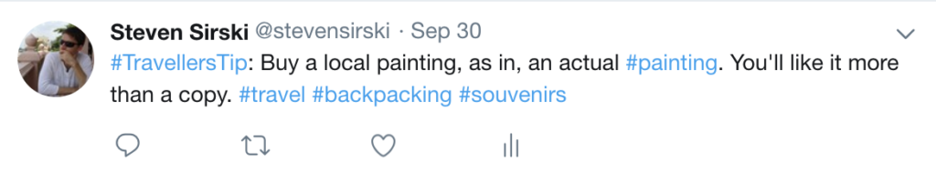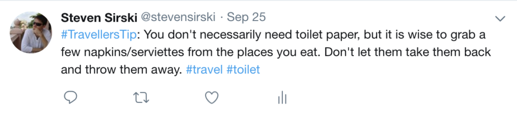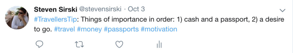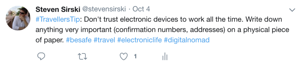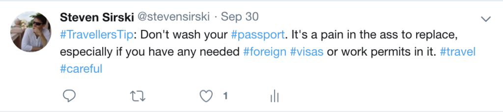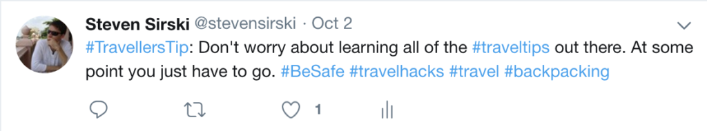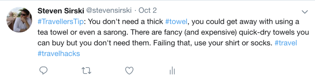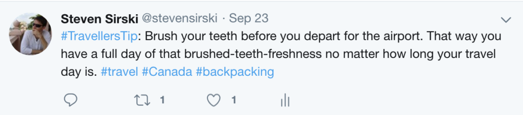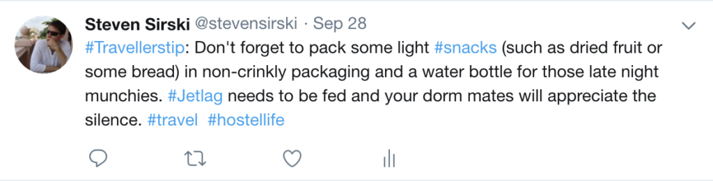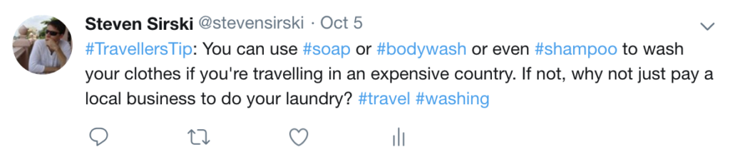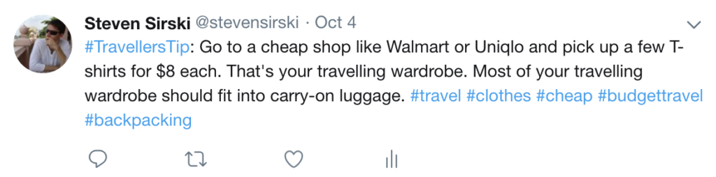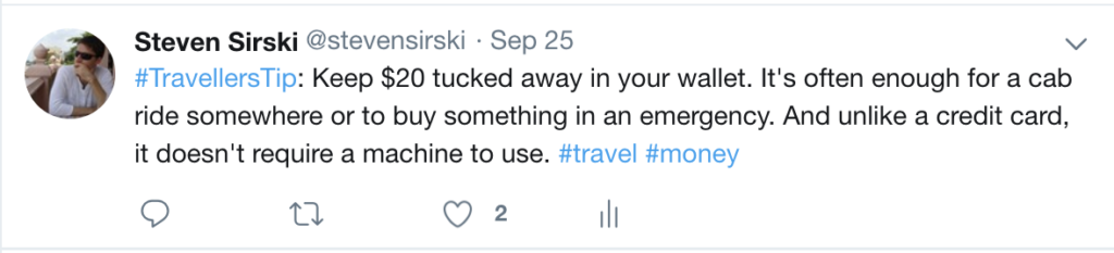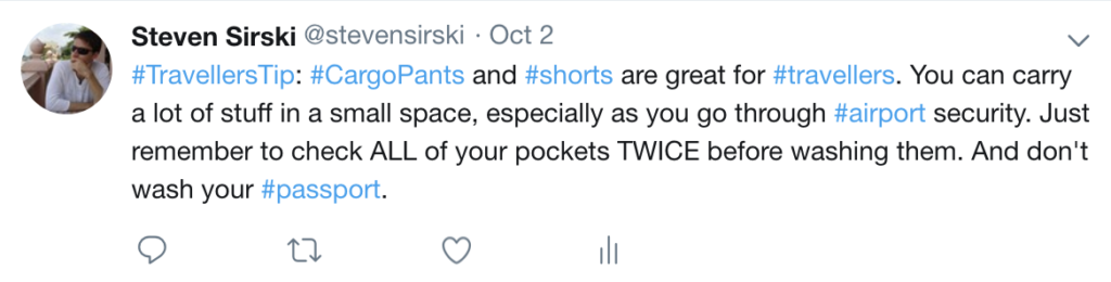 So back a few months ago I posted a series of tweets with the idea that maybe they’d be useful to others who are thinking about travelling. This list isn’t exhaustive but things are some of the things I’ve picked up along the way. Some should probably be explained a little more but I think the majority stand on their own. Further, many of these would probably fit into the “unconventional” column of tips for travelling since some are “travel hacks” instead of some sort of tip. Take them for what they are, some things to keep in mind. Here they are in order of posting: