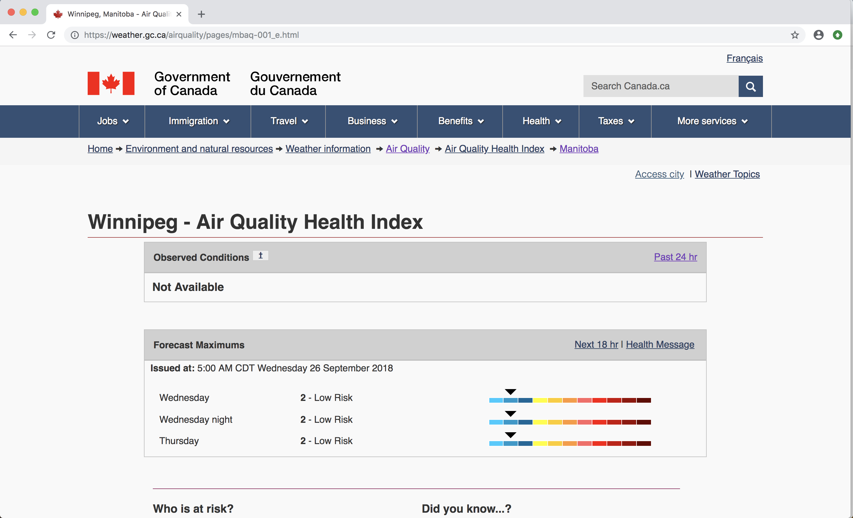 And a couple people also pointed out that the mosquitos weren’t an issue this past year, and a friend even suggested that they were preferable to the smog I encounter in Beijing. And they have a point: Winnipeg’s AQHI is at “Level 1” which means it sits somewhere between 0 and 30 in terms of PM2.5 matter. Here’s a screenshot from the Government of Canada website: